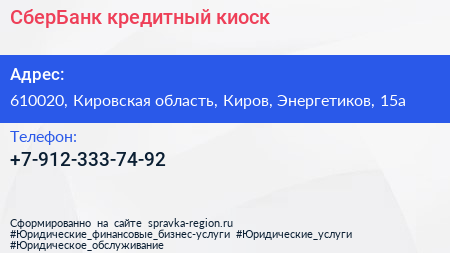 СберБанк, кредитный киоск по адресу 610020, Кировская область, Киров, Энергетиков, 15а в дальнейшем Организация, размещена в следующих категориях: