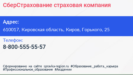 СберСтрахование, страховая компания по адресу 610017, Кировская область, Киров, Горького, 25 в дальнейшем Организация, размещена в следующих категориях: