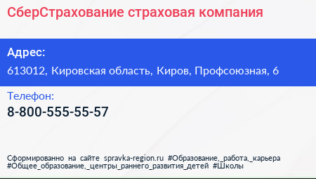 СберСтрахование, страховая компания по адресу 613012, Кировская область, Киров, Профсоюзная, 6 в дальнейшем Организация, размещена в следующих категориях: