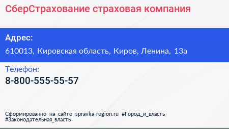 СберСтрахование, страховая компания по адресу 610013, Кировская область, Киров, Ленина, 13а в дальнейшем Организация, размещена в следующих категориях: