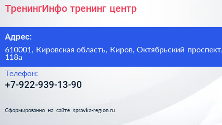 ТренингИнфо, тренинг-центр по адресу 610001, Кировская область, Киров, Октябрьский проспект, 118а в дальнейшем Организация, размещена в следующих категориях: