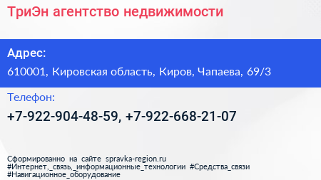 ТриЭн, агентство недвижимости по адресу 610001, Кировская область, Киров, Чапаева, 69/3 в дальнейшем Организация, размещена в следующих категориях: