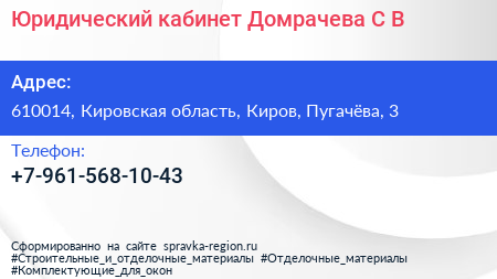 Юридический кабинет Домрачева С.В. по адресу 610014, Кировская область, Киров, Пугачёва, 3 в дальнейшем Организация, размещена в следующих категориях:
