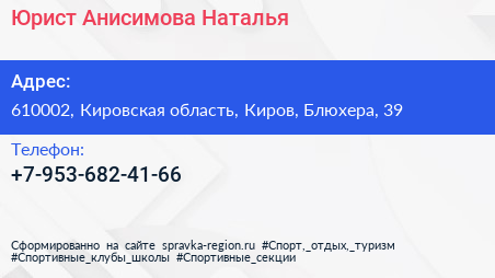Юрист Анисимова Наталья по адресу 610002, Кировская область, Киров, Блюхера, 39 в дальнейшем Организация, размещена в следующих категориях: