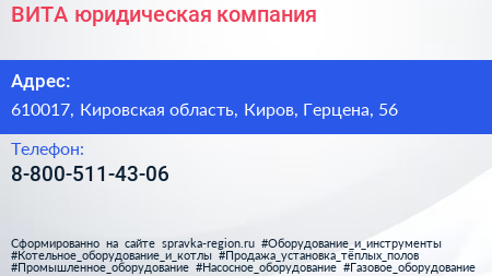 ВИТА, юридическая компания по адресу 610017, Кировская область, Киров, Герцена, 56 в дальнейшем Организация, размещена в следующих категориях: