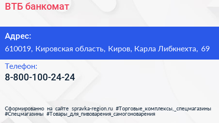 ВТБ, банкомат по адресу 610019, Кировская область, Киров, Карла Либкнехта, 69 в дальнейшем Организация, размещена в следующих категориях: