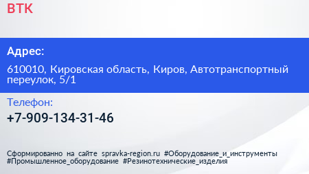 ВТК по адресу 610010, Кировская область, Киров, Автотранспортный переулок, 5/1 в дальнейшем Организация, размещена в следующих категориях: