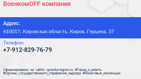 ВоенкомOFF, компания по адресу 610017, Кировская область, Киров, Герцена, 37 в дальнейшем Организация, размещена в следующих категориях: