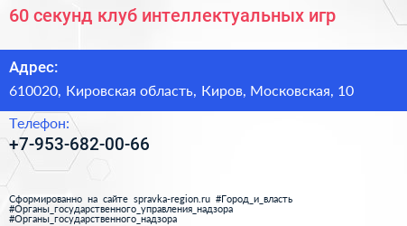 60 секунд, клуб интеллектуальных игр по адресу 610020, Кировская область, Киров, Московская, 10 в дальнейшем Организация, размещена в следующих категориях: