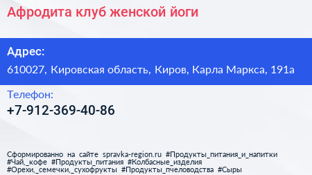 Афродита, клуб женской йоги по адресу 610027, Кировская область, Киров, Карла Маркса, 191а в дальнейшем Организация, размещена в следующих категориях: