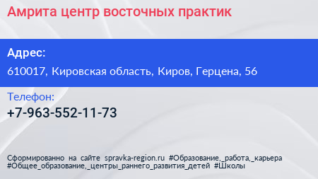 Амрита, центр восточных практик по адресу 610017, Кировская область, Киров, Герцена, 56 в дальнейшем Организация, размещена в следующих категориях: