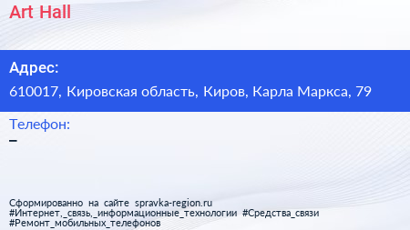 Art-Hall по адресу 610017, Кировская область, Киров, Карла Маркса, 79 в дальнейшем Организация, размещена в следующих категориях: