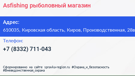 Asfishing, рыболовный магазин по адресу 610035, Кировская область, Киров, Производственная, 28в в дальнейшем Организация, размещена в следующих категориях:
