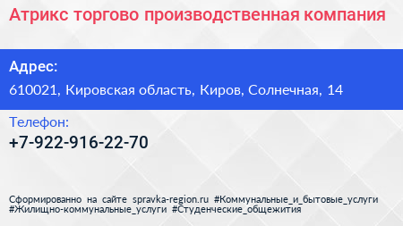 Атрикс, торгово-производственная компания по адресу 610021, Кировская область, Киров, Солнечная, 14 в дальнейшем Организация, размещена в следующих категориях: