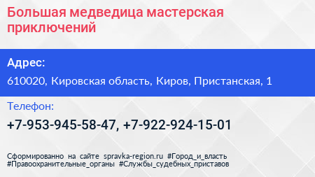 Большая медведица, мастерская приключений по адресу 610020, Кировская область, Киров, Пристанская, 1 в дальнейшем Организация, размещена в следующих категориях: