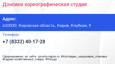 Дэнсики, хореографическая студия по адресу 610030, Кировская область, Киров, Клубная, 9 в дальнейшем Организация, размещена в следующих категориях: