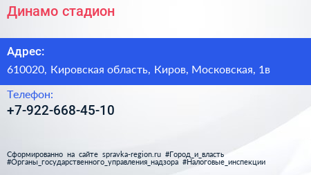 Динамо, стадион по адресу 610020, Кировская область, Киров, Московская, 1в в дальнейшем Организация, размещена в следующих категориях: