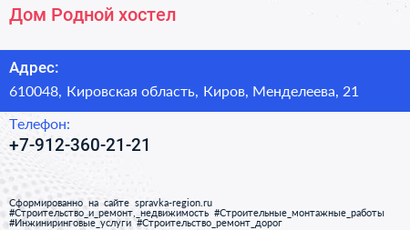 Дом Родной, хостел по адресу 610048, Кировская область, Киров, Менделеева, 21 в дальнейшем Организация, размещена в следующих категориях: