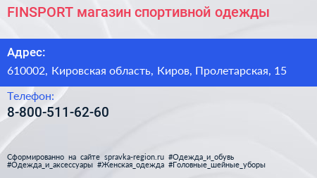 FINSPORT, магазин спортивной одежды по адресу 610002, Кировская область, Киров, Пролетарская, 15 в дальнейшем Организация, размещена в следующих категориях: