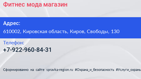 Фитнес-мода, магазин по адресу 610002, Кировская область, Киров, Свободы, 130 в дальнейшем Организация, размещена в следующих категориях: