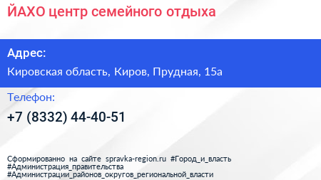 ЙАХО!, центр семейного отдыха по адресу Кировская область, Киров, Прудная, 15а в дальнейшем Организация, размещена в следующих категориях: