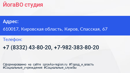 ЙогаВО, студия по адресу 610017, Кировская область, Киров, Спасская, 67 в дальнейшем Организация, размещена в следующих категориях: