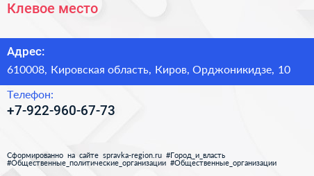 Клевое место по адресу 610008, Кировская область, Киров, Орджоникидзе, 10 в дальнейшем Организация, размещена в следующих категориях:
