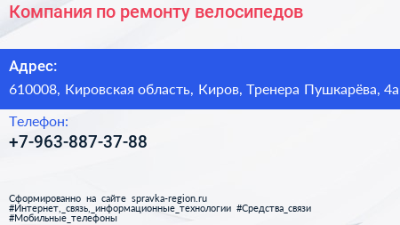 Компания по ремонту велосипедов по адресу 610008, Кировская область, Киров, Тренера Пушкарёва, 4а в дальнейшем Организация, размещена в следующих категориях: