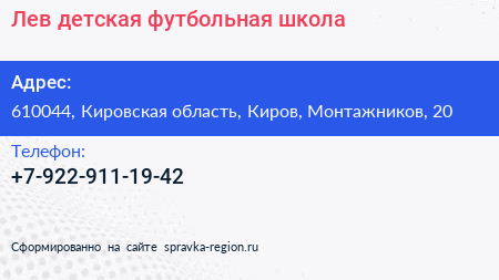 Лев, детская футбольная школа по адресу 610044, Кировская область, Киров, Монтажников, 20 в дальнейшем Организация, размещена в следующих категориях: