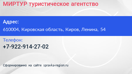 МИРТУР, туристическое агентство по адресу 610004, Кировская область, Киров, Ленина, 54 в дальнейшем Организация, размещена в следующих категориях: