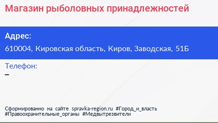 Магазин рыболовных принадлежностей по адресу 610004, Кировская область, Киров, Заводская, 51Б в дальнейшем Организация, размещена в следующих категориях: