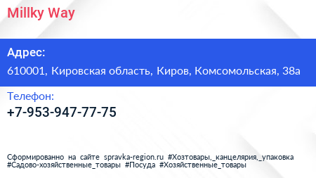 Millky Way по адресу 610001, Кировская область, Киров, Комсомольская, 38а в дальнейшем Организация, размещена в следующих категориях: