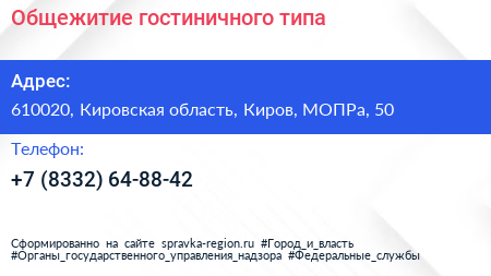 Общежитие гостиничного типа по адресу 610020, Кировская область, Киров, МОПРа, 50 в дальнейшем Организация, размещена в следующих категориях:
