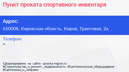 Пункт проката спортивного инвентаря по адресу 610008, Кировская область, Киров, Трактовая, 2а в дальнейшем Организация, размещена в следующих категориях: