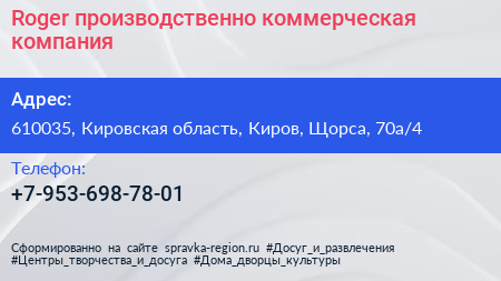 Roger, производственно-коммерческая компания по адресу 610035, Кировская область, Киров, Щорса, 70а/4 в дальнейшем Организация, размещена в следующих категориях: