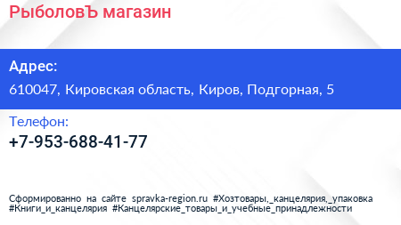 РыболовЪ, магазин по адресу 610047, Кировская область, Киров, Подгорная, 5 в дальнейшем Организация, размещена в следующих категориях: