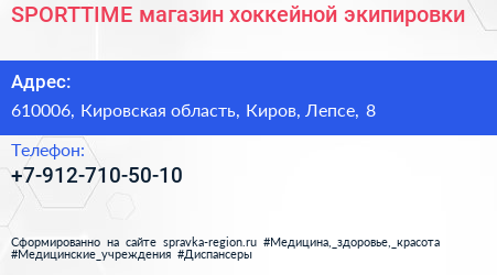 SPORTTIME, магазин хоккейной экипировки по адресу 610006, Кировская область, Киров, Лепсе, 8 в дальнейшем Организация, размещена в следующих категориях: