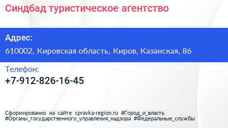 Синдбад, туристическое агентство по адресу 610002, Кировская область, Киров, Казанская, 86 в дальнейшем Организация, размещена в следующих категориях: