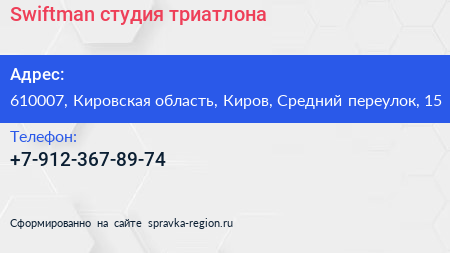 Swiftman, студия триатлона по адресу 610007, Кировская область, Киров, Средний переулок, 15 в дальнейшем Организация, размещена в следующих категориях: