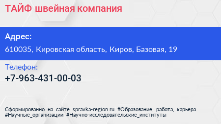 ТАЙФ, швейная компания по адресу 610035, Кировская область, Киров, Базовая, 19 в дальнейшем Организация, размещена в следующих категориях:
