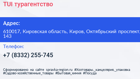 TUI, турагентство по адресу 610017, Кировская область, Киров, Октябрьский проспект, 143 в дальнейшем Организация, размещена в следующих категориях: