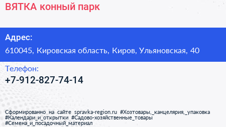ВЯТКА, конный парк по адресу 610045, Кировская область, Киров, Ульяновская, 40 в дальнейшем Организация, размещена в следующих категориях: