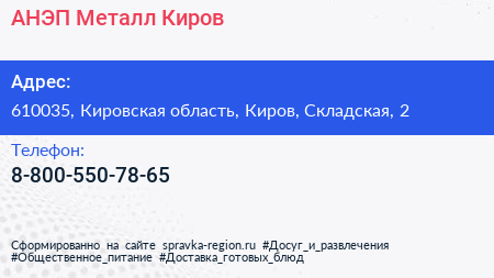 АНЭП-Металл Киров по адресу 610035, Кировская область, Киров, Складская, 2 в дальнейшем Организация, размещена в следующих категориях: