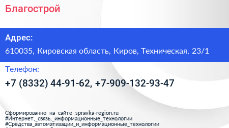 Благострой по адресу 610035, Кировская область, Киров, Техническая, 23/1 в дальнейшем Организация, размещена в следующих категориях: