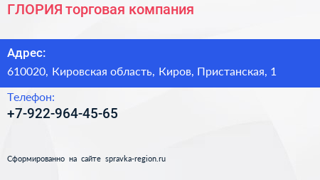 ГЛОРИЯ, торговая компания по адресу 610020, Кировская область, Киров, Пристанская, 1 в дальнейшем Организация, размещена в следующих категориях: