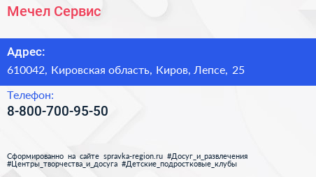 Мечел-Сервис по адресу 610042, Кировская область, Киров, Лепсе, 25 в дальнейшем Организация, размещена в следующих категориях:
