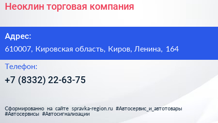 Неоклин, торговая компания по адресу 610007, Кировская область, Киров, Ленина, 164 в дальнейшем Организация, размещена в следующих категориях: