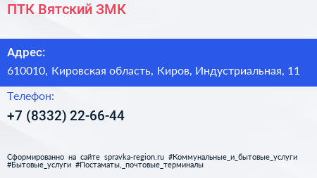 ПТК Вятский ЗМК по адресу 610010, Кировская область, Киров, Индустриальная, 11 в дальнейшем Организация, размещена в следующих категориях: