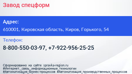 Завод спецформ по адресу 610001, Кировская область, Киров, Горького, 54 в дальнейшем Организация, размещена в следующих категориях: