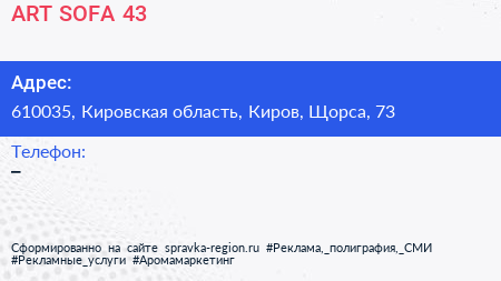 ART SOFA 43 по адресу 610035, Кировская область, Киров, Щорса, 73 в дальнейшем Организация, размещена в следующих категориях: